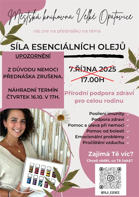 Z důvodu nemoci se přednáška o esenciálních olejích, plánovaná na 7.10. ruší a uskuteční se v náhradním termínu: ČTVRTEK 16.ŘÍJNA od 17h v knihovna.